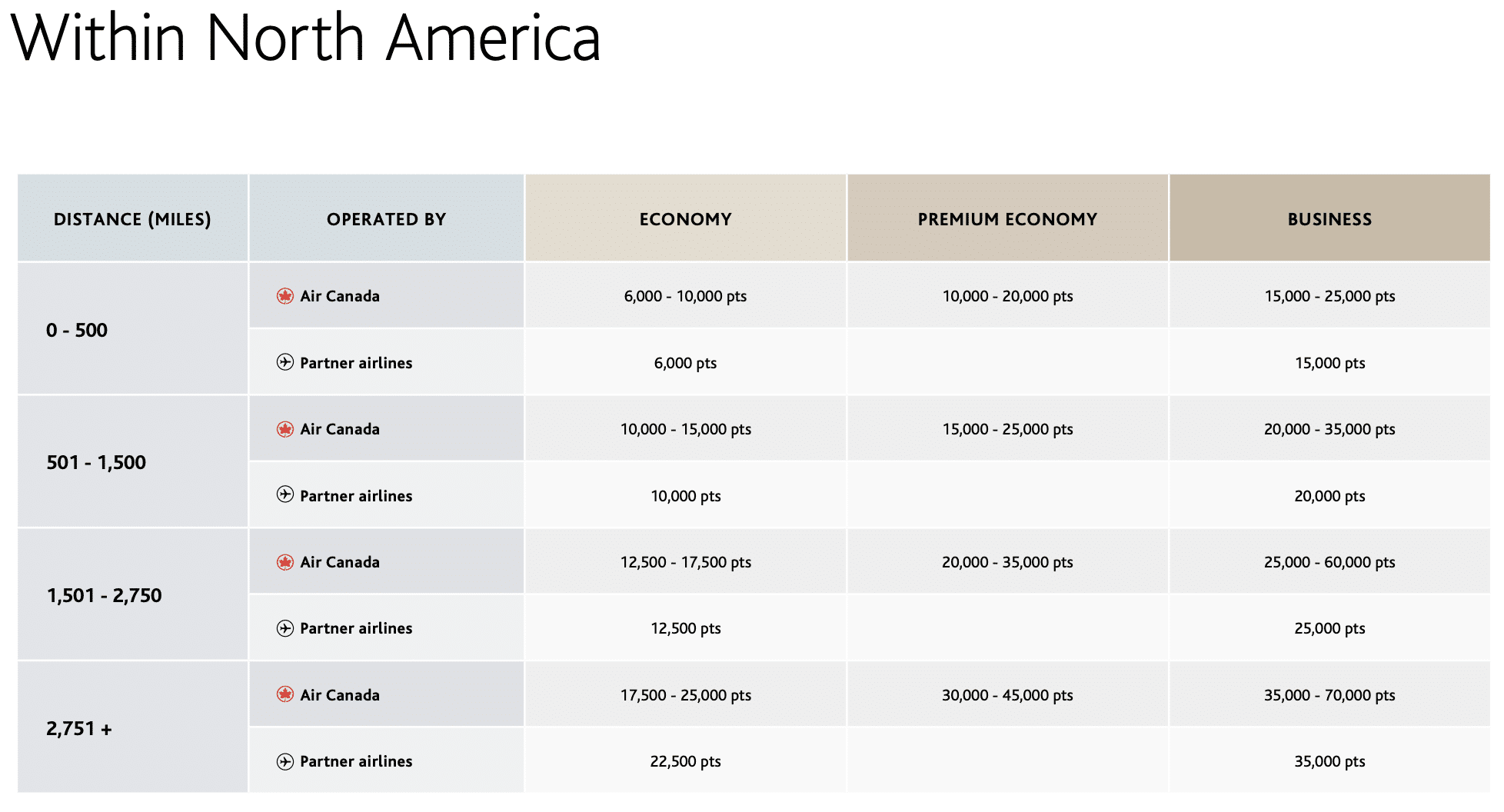 Every Aeroplan redemption begins with the Aeroplan Flight Reward Chart. For Sun destinations, you’ll be referencing the “Within North America” section, as these locations fall under that category.