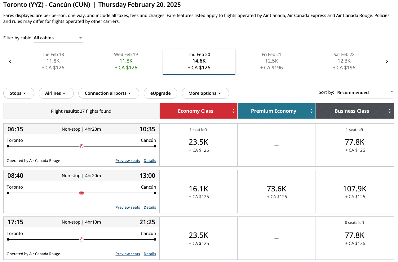 As an example, looking at a recent search, you could book a one-way direct economy flight from Toronto to Cancún for 16,100 Aeroplan points and $126 (all figures in CAD) in taxes and fees.