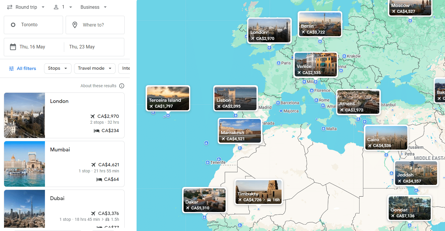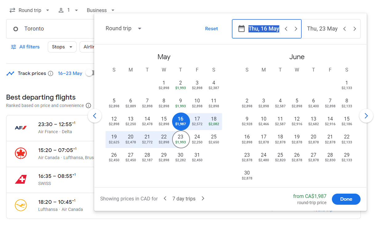 Booking business class flights with RBC Avion Rewards offers more flexibility in choosing flights. With this option, you won’t have to wait for award availability to show up, and you can easily compare all of the cheapest flight options through Google Flights.