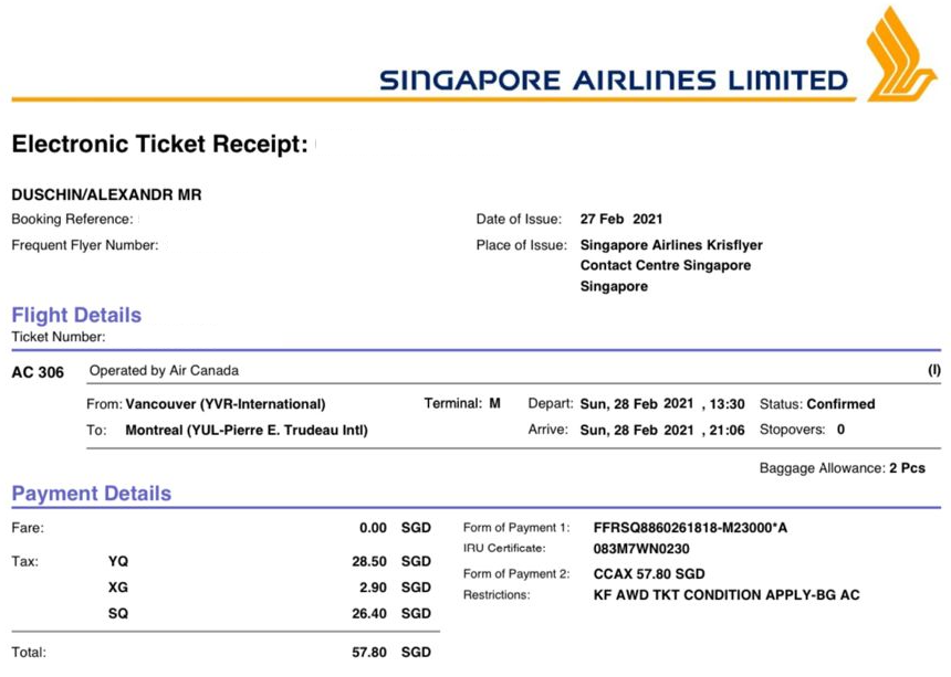 Redeeming Singapore Airlines KrisFlyer Miles on Air Canada