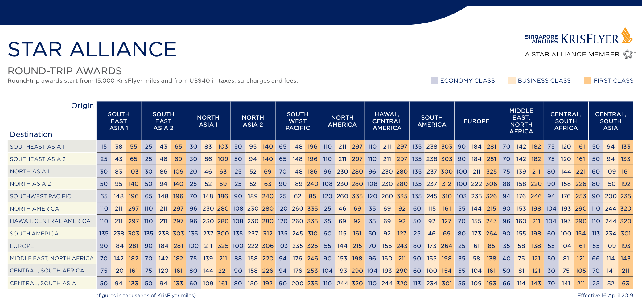 The Singapore Airlines KrisFlyer partner award chart reads as follows: