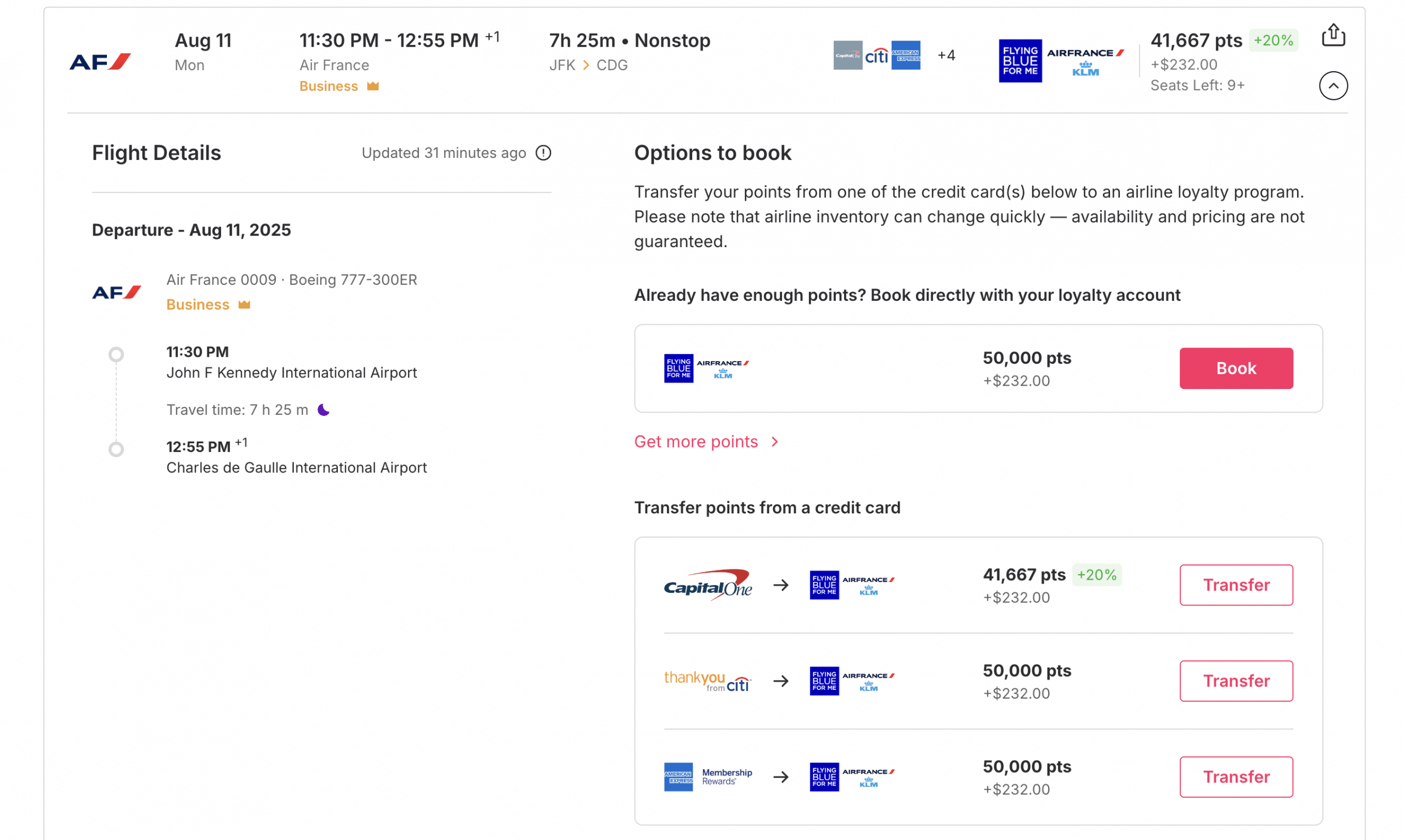 Roame will let you know if there is a transfer bonus with the reduced points price, the transfer bonus percent next to the points cost, and a logo corresponding to the card program offering the bonus. In the example above, Capital One Miles is offering a 20% transfer bonus to Flying Blue.