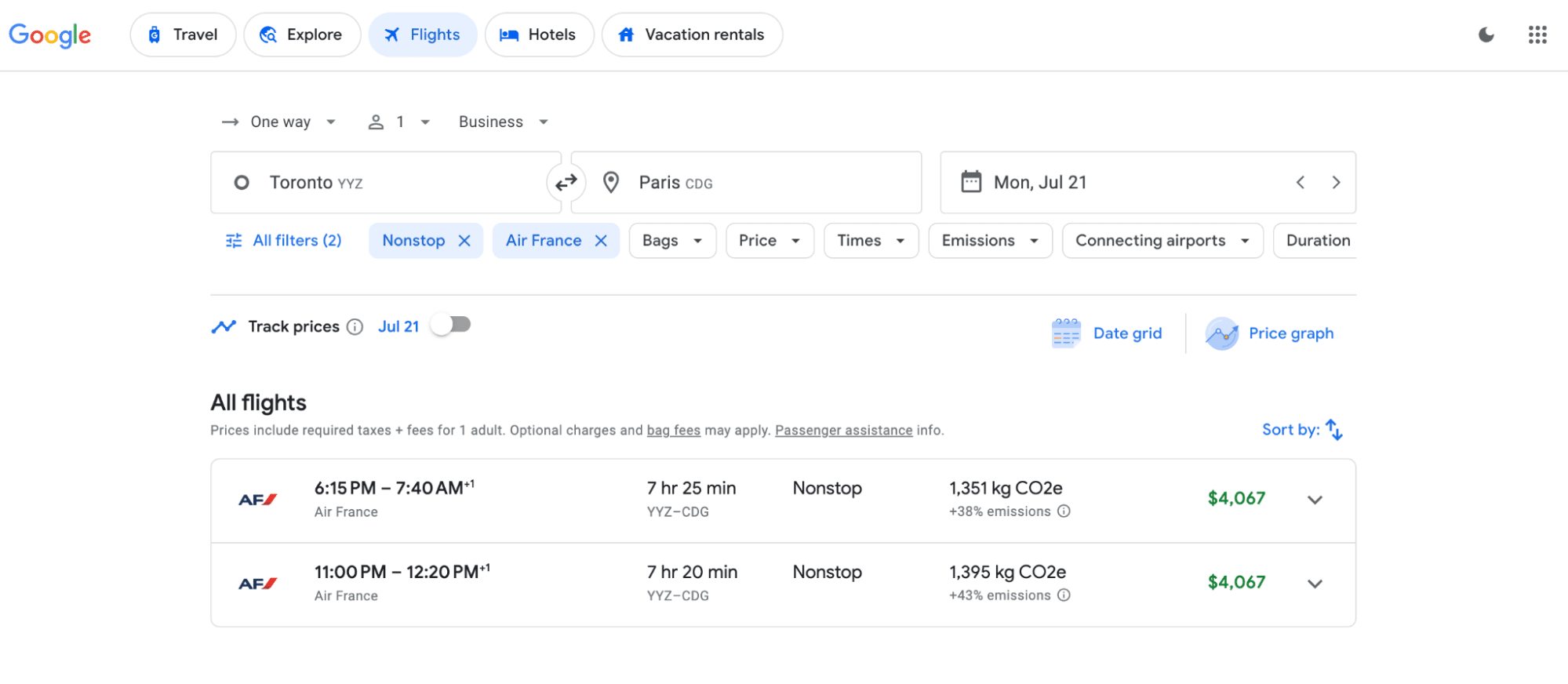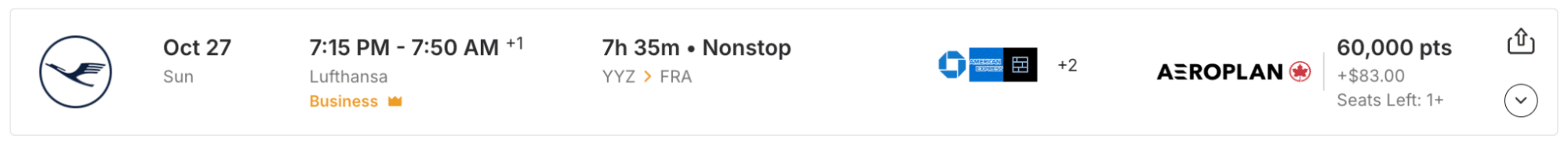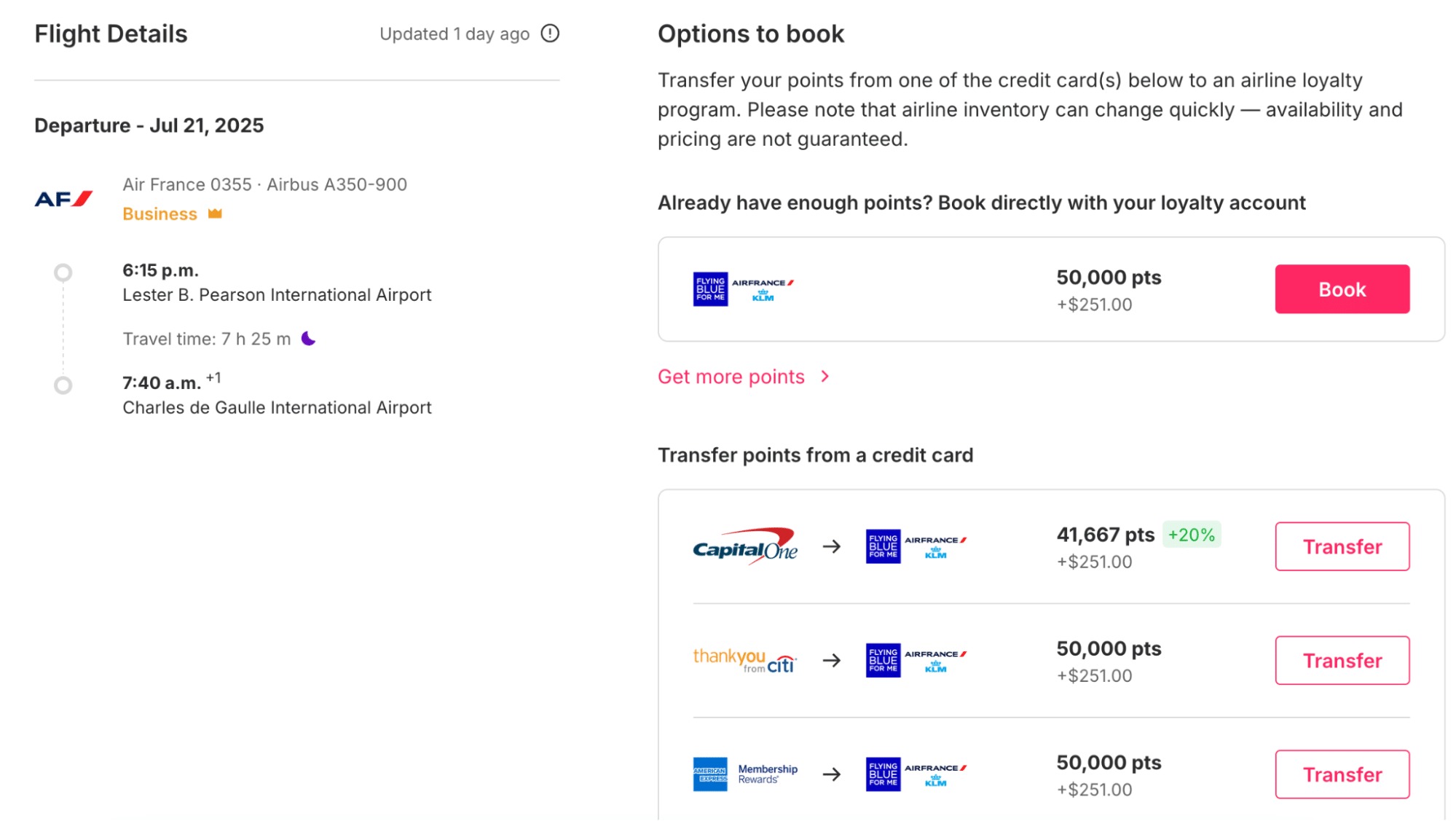 In the example above, Roame was easily able to find a non-stop Air France business class flight on Air France KLM Flying Blue from Toronto to Paris for only 41,667 miles (with a transfer bonus) or 50,000 miles (without a transfer bonus).