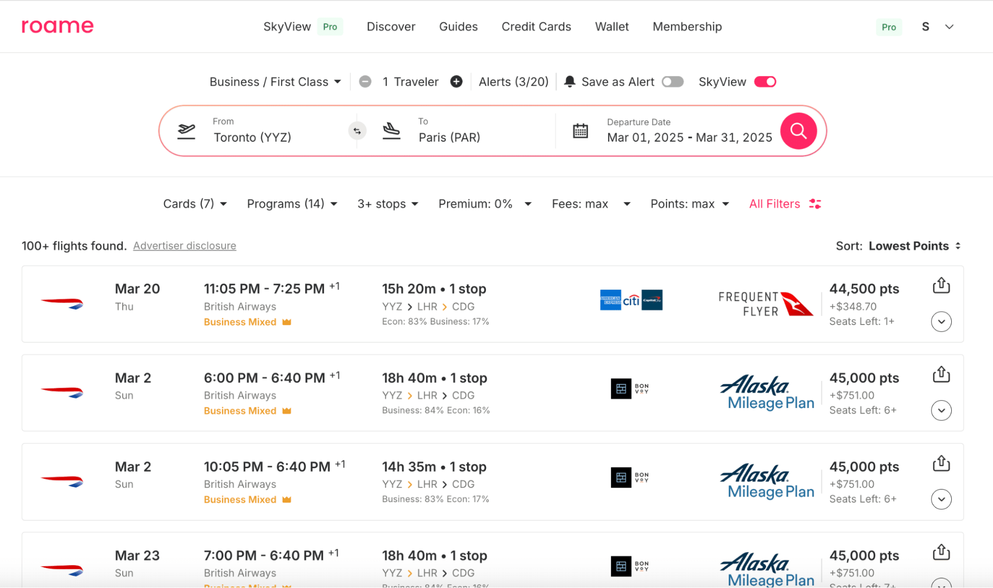 With its proprietary SkyView feature, which, with a paid membership, lets you search across a date range of up to 60 days and between multiple geographic regions, Roame makes searching for award flights faster and easier.