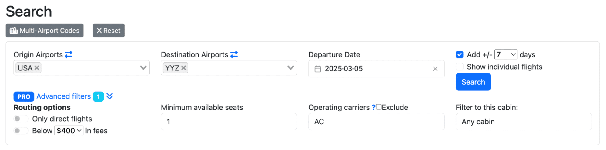 Comparatively, Roame only allows you to search a single airport, airport city code, or geographical region at a time for both origin and destination.