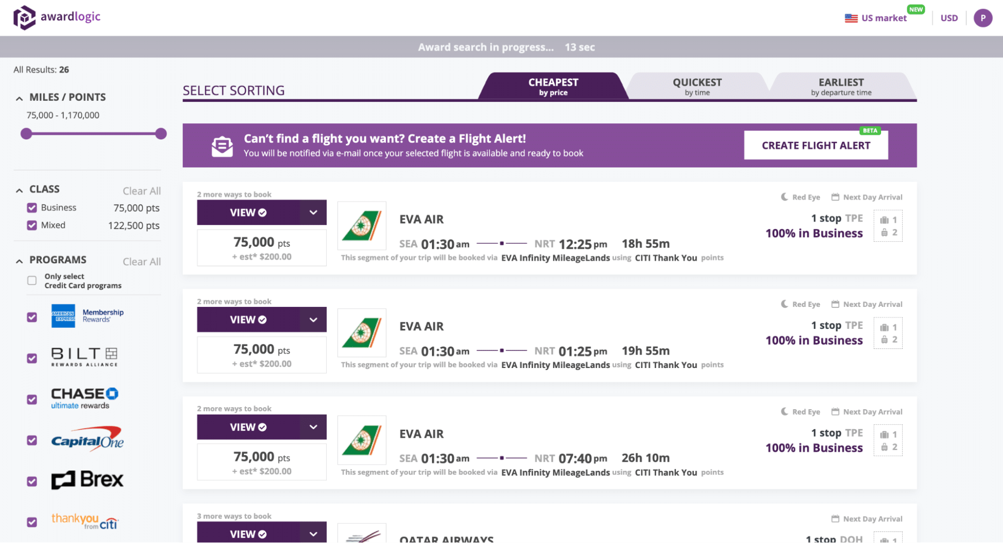 With AwardLogic, results can be filtered by program, number of stops, time of day, airlines, and duration of flight leg and/or layover, and the flight results can also be viewed under three different tabs sorted by earliest flights, quickest flights, and cheapest flights.