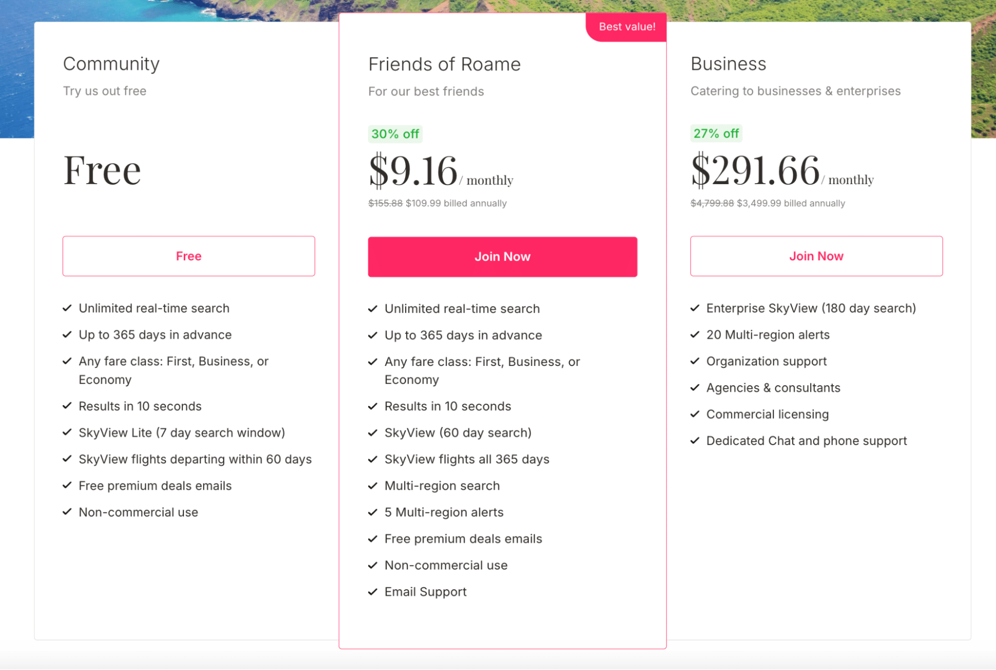 - Friends of Roame: $12.99 (all figures in USD) monthly or $109.99 annually (priced to save you 30% over the year at an average of $9.16 per month)