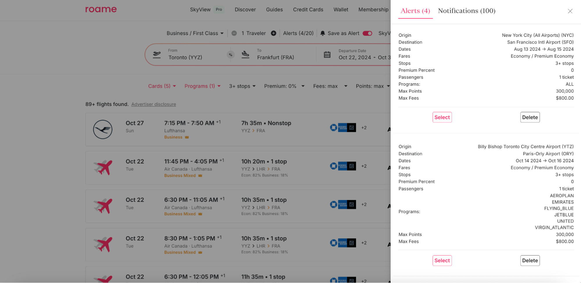 Additionally, an important sub-feature of SkyView is the ability to set alerts. As you do your searches, you can toggle the alert button and receive notifications when an award flight that matches your set criteria becomes available. With a paid membership, you can set up to five alerts at the same time, and with the free membership, you can save one alert at a time.