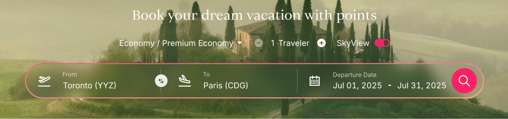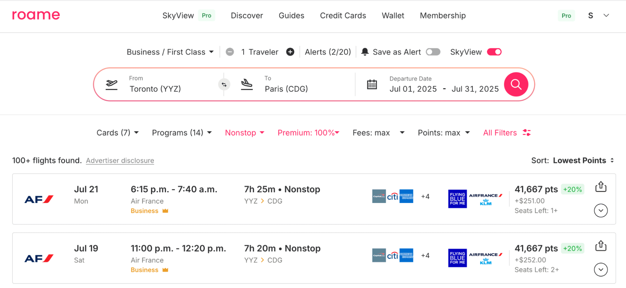 To show Roame’s search function in action, let’s imagine that you’d like to find a flight from Toronto (YYZ) to Paris (CDG) in business class or First Class, and that you’d like to fly in July 2025.