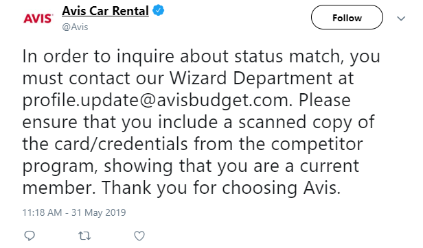 From National, you can then request a status match to Avis. Avis makes frequent mention of their status match opportunities on Twitter with the simple process of emailing profile.update@avisbudget.com. Typically, a match is only done to the introductory tier, Avis Preferred Plus, which offers accelerated point earnings and complimentary upgrades. While nothing exceptional, it’s certainly worth a quick email if you have upcoming rentals with Avis.
