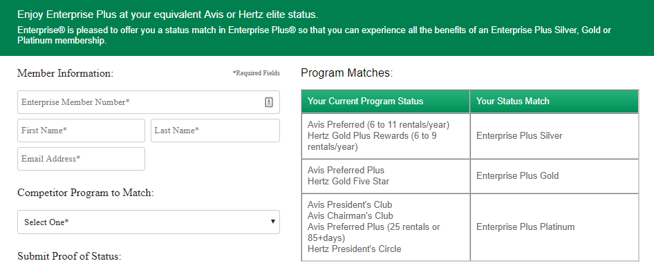 Finally, Enterprise has a similar (albeit less generous) status match scheme to National matching Avis or Hertz status to their equivalent membership level. Avis Preferred Plus and Hertz Gold Five Star both match to Enterprise Plus Gold, which comes with bonus points and two confirmed upgrades each year.