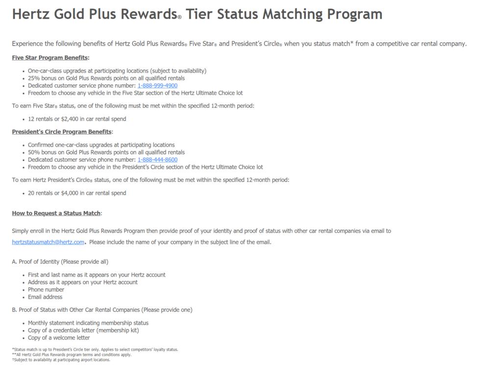 The status match is processed through an email address where you must send relevant details (and proof): hertzstatusmatch@hertz.com. While the website makes reference to a company name being required, many data points exist for a successful match even without mentioning a company name.