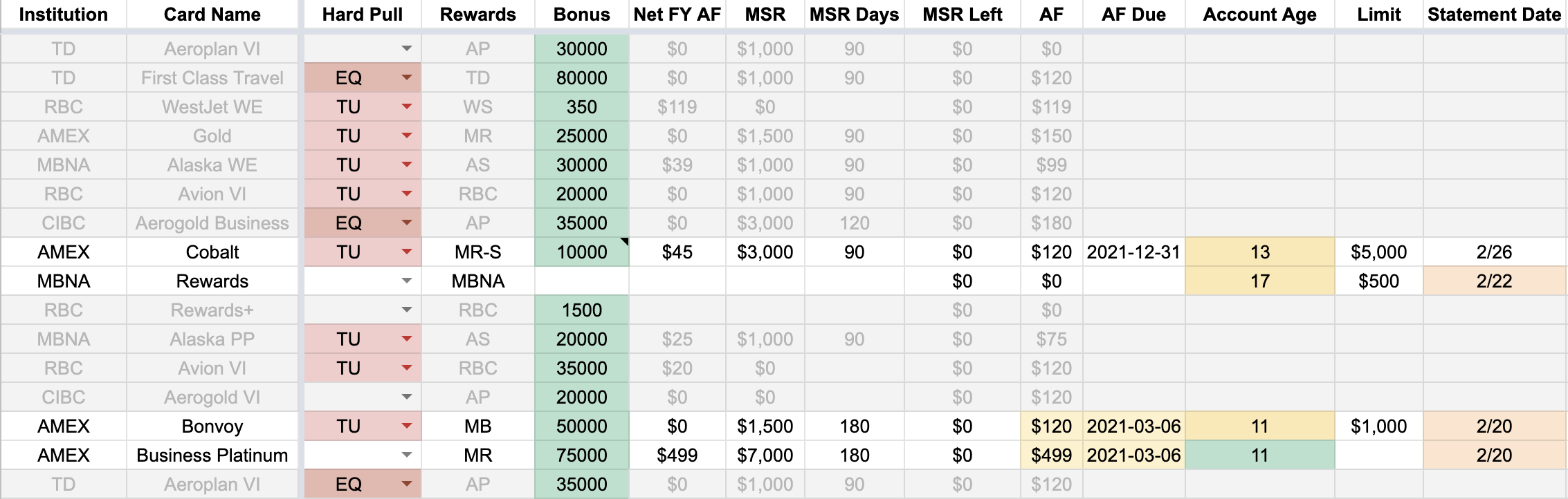 I primarily use three separate spreadsheets to track everything: one for transactions, one for points, and one for credit cards.