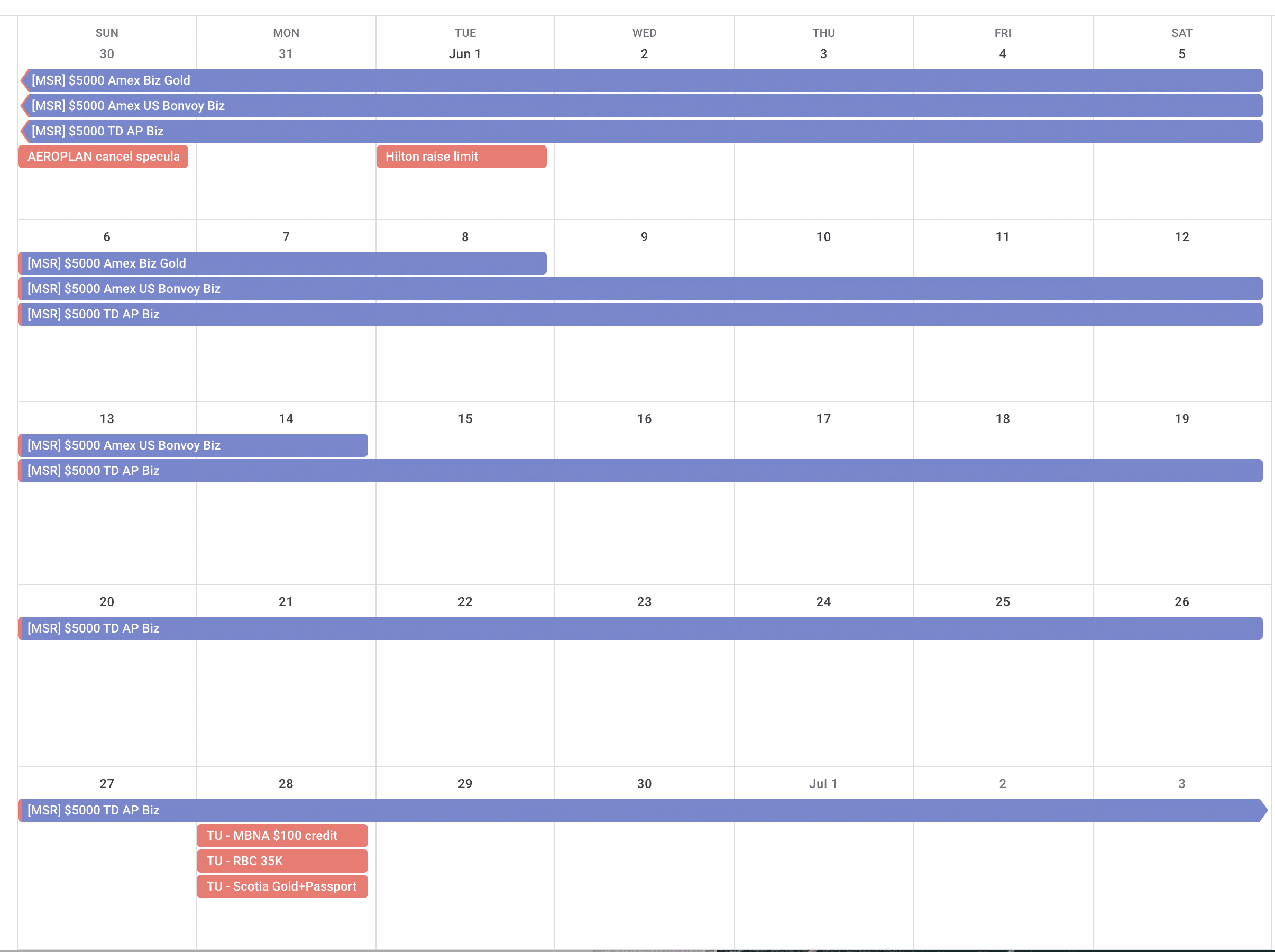 I try to maintain a rough sketch of my next steps as far out as the next “event” (application, cancellation, product switch, or annual fee) for each card. Things do change unexpectedly, though, so I always check on my credit card timelines each month in case I need to make adjustments.