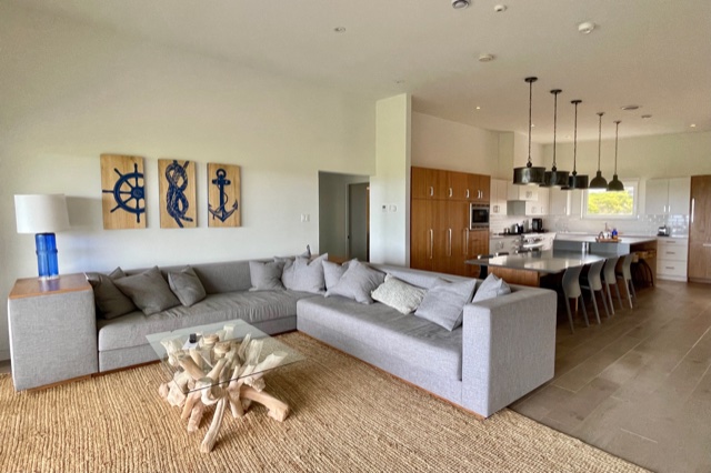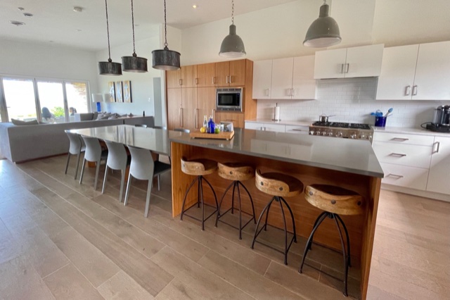 The kitchen was fully stocked with dinnerware, cookware, and utensils, with plenty of counter space. A huge centre island with bar seating stretched out into a table that could seat eight.
