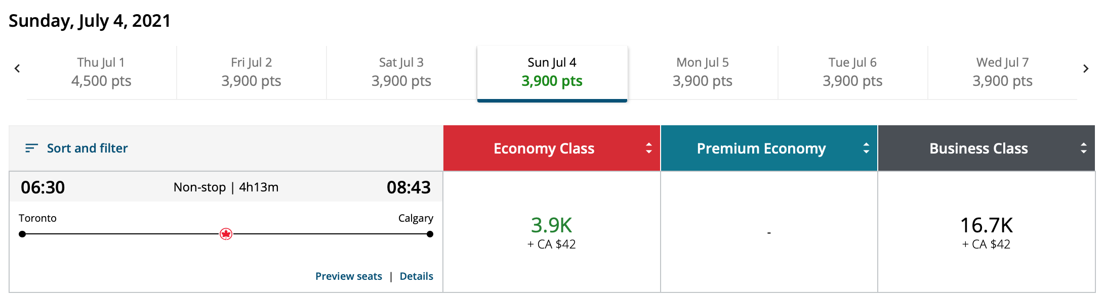 Flights within Canada right now are at an all-time low, with round-trip economy flights from Toronto to Calgary on Air Canada available for $234 throughout the summer, or just over 8,000 Aeroplan points!