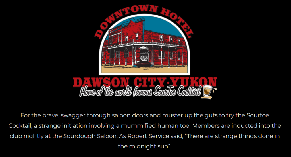 A former co-worker of mine who grew up in Dawson City suggested that the Sour Toe Cocktail at the Sourdough Saloon is something worth trying. To become an official member of the club, you have to purchase a shot, recite the “Sourtoe Oath,” and then consume your shot with an actual, preserved human toe placed in your glass.