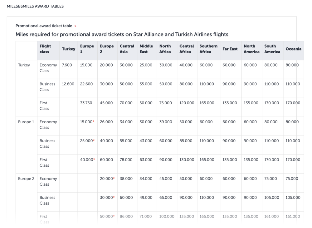 Turkish uses award charts based on geographic zones, and there are quite a number of different award charts listed on the page, which can be confusing at first glance. The chart we want is the “Promotional Award Ticket Table”, which applies to the regular award inventory on Turkish Airlines and Star Alliance flights.