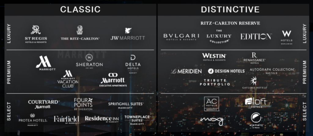 Classic brands encompass traditional, flagship brands that most guests have come to know the Marriott label by. Distinctive brands are the newer kids on the block that carry a hip vibe and try to cater to millennials.