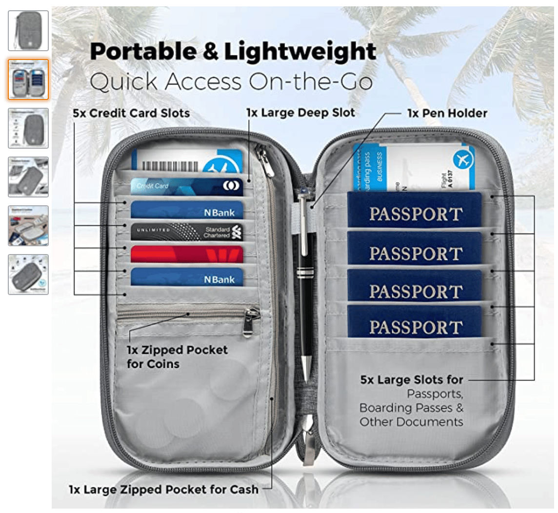 To avoid the hassle of misplacing anything, a large passport carrier that can fit everyone’s passports is very helpful. Just go onto Amazon and you’ll find plenty of options with passport slots, zippered compartments, and card slots for all those credit cards you may be carrying as well. 😉