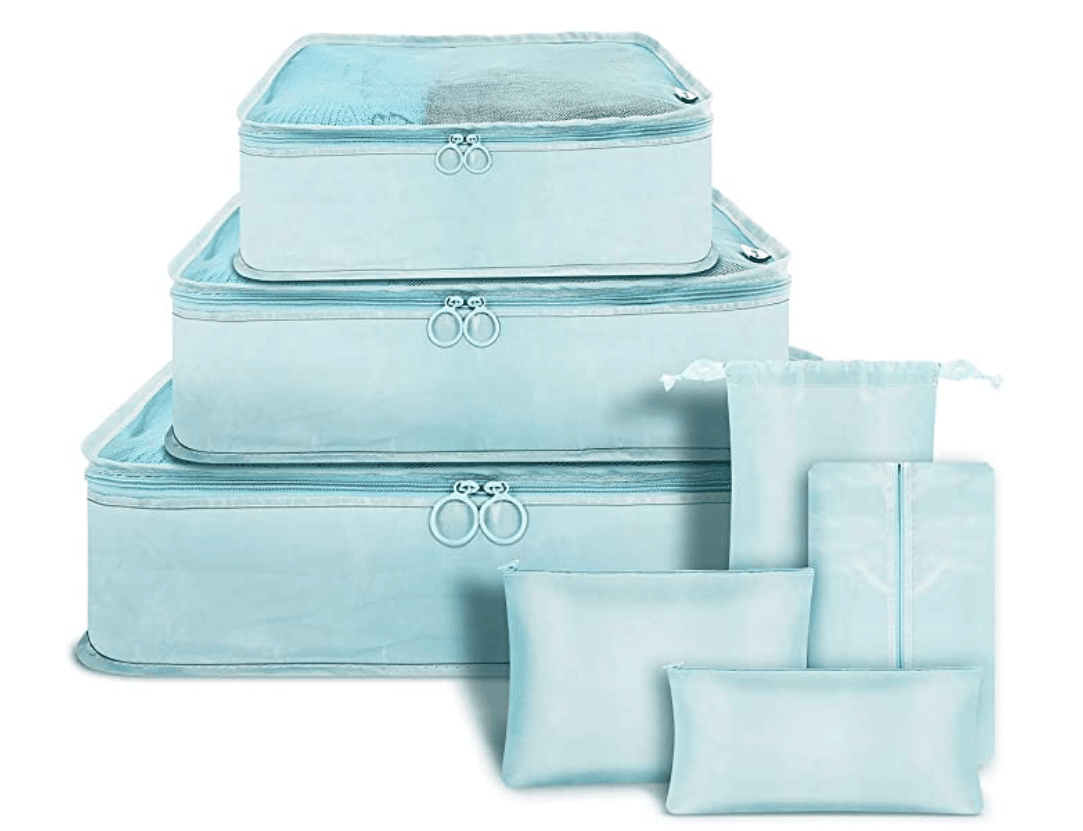 Each kid has their own colour of cubes for their underwear and socks, pajamas, swim clothes, and accessories. Get the kids involved in the packing, too, by giving them their own cubes to fill up and bring back to you.
