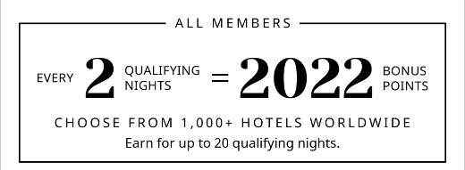 In the past, members received 2,022 bonus points for every two qualifying nights, up to a total of 20 qualifying nights. This meant that every two-night stay at an off-peak Category 1 hotel only cost 4,978 points (2,489 points per night).