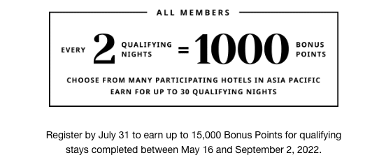 While not quite as lucrative, there is currently a promotion where members staying in participating Asia Pacific Hyatt hotels earn 1,000 bonus points for every two qualifying nights before September 2, 2022. To benefit from this offer, you must register before July 31.