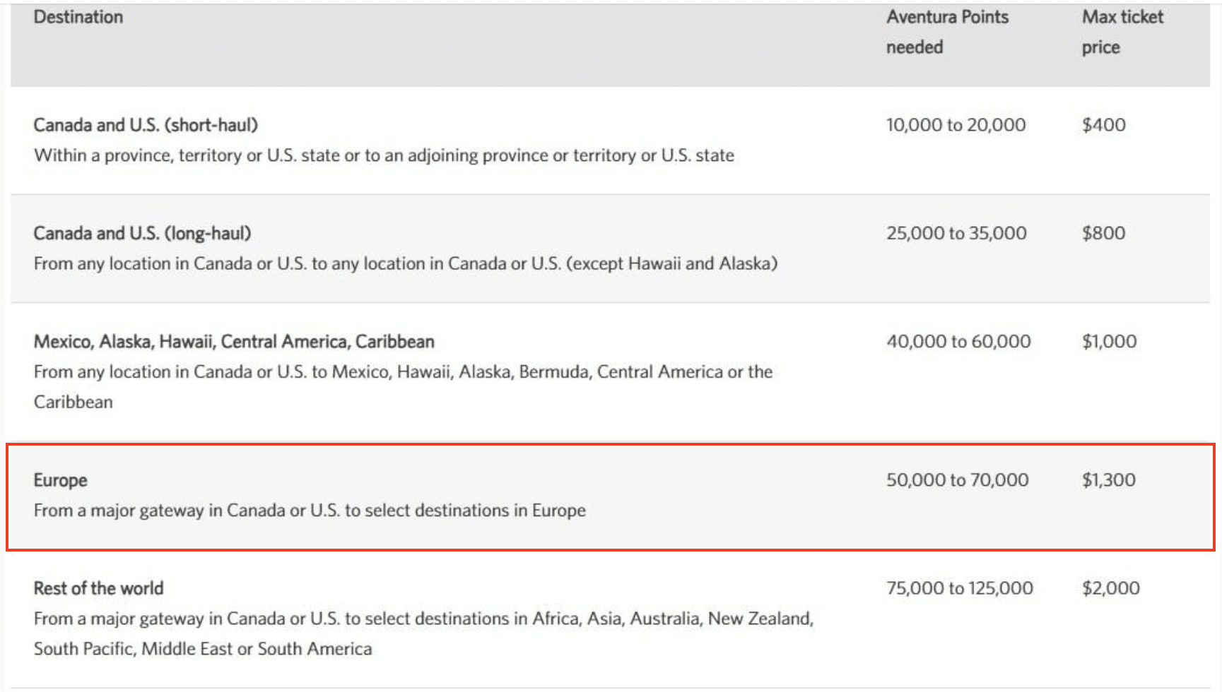 If your round-trip flight to Europe costs more than 50,000 points through an airline program and the fare is under $1,300 before taxes and fees, it’s worth checking how much the same flight would cost using CIBC Aventura points with their fixed travel chart.