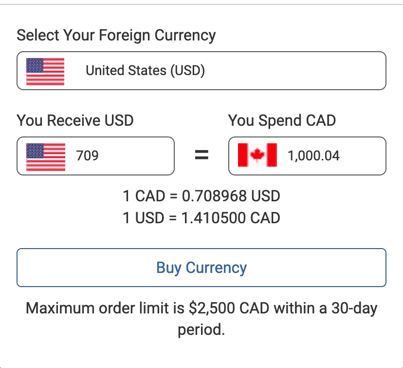 I will note that my critique of this service, aside from it not having the best exchange rates on the market, is that you’re limited to only $2,500 (CAD) worth of foreign cash per 30 days. Still, the convenience of this service is top-notch, making it a great option.