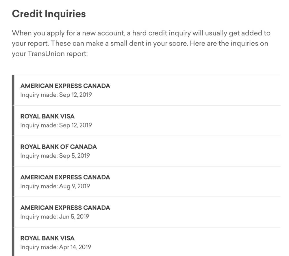 For example, MBNA is known to be quite strict on how many recent inquiries they see on your file. If they see too many inquiries within the past six months, they’re likely to deem it as “credit-seeking behaviour” and decline your for a new card, even if your score is in the high 800s.