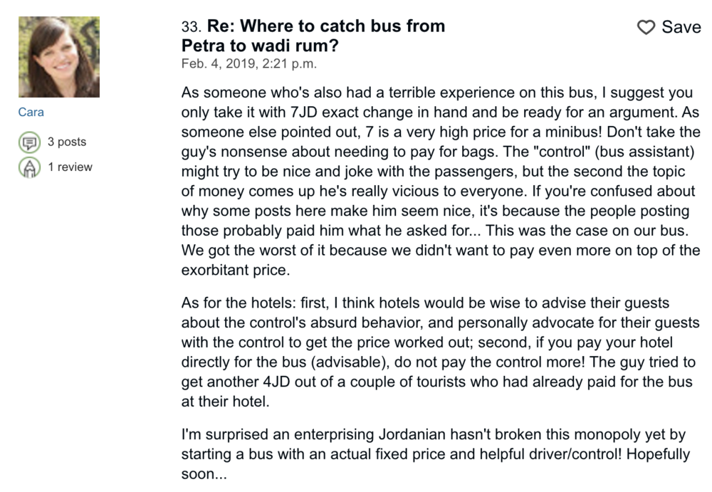 Since there’s no bus schedule or anything, there’s no indication of how much the two-hour bus journey costs. The TripAdvisor reviews, however, revealed that the bus is supposed to cost 7 JD ($13) per person, although the bus conductor can and will try to overcharge everyone onboard and ask for 10 JD ($19) instead.
