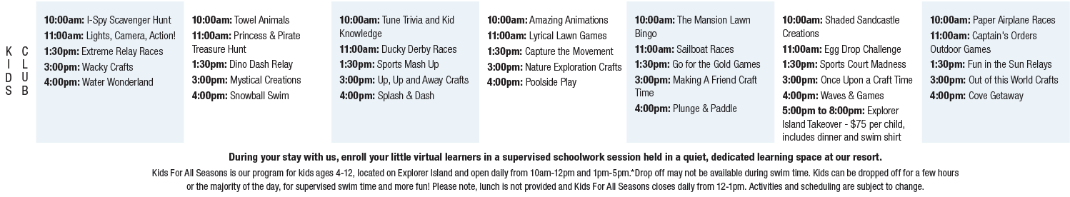 - Available July & August only, complimentary with some activities requiring an additional charge, supervision provided, for ages 4 to 11 years old
