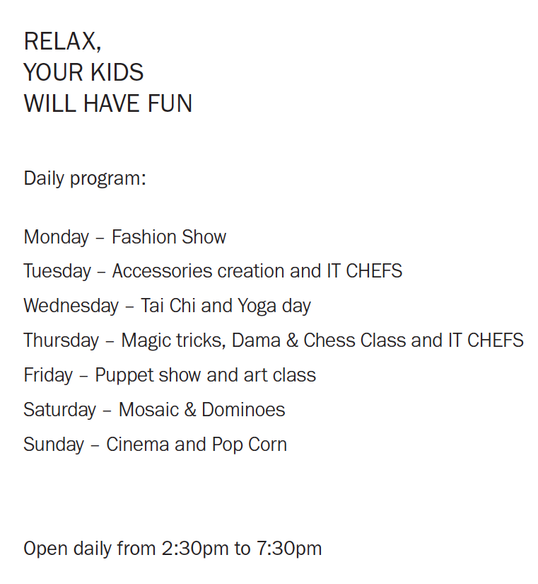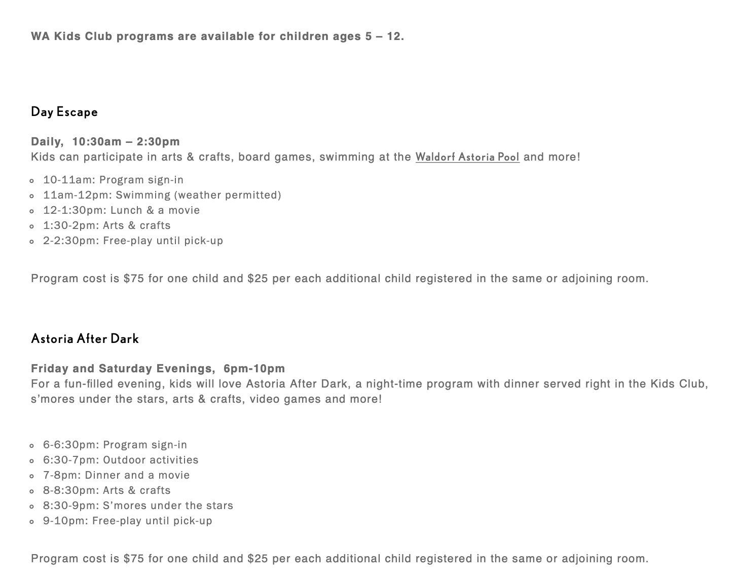 - Hours of operation. Some programs offer activities and supervision all-day, while others only at certain times on specific days. If you’re planning on taking a day tour without the kids, it is important to ask about drop-off and pick-up times and how strict they are with them. A hotel once made an exception for us and opened 30 minutes earlier so we could make our tour.