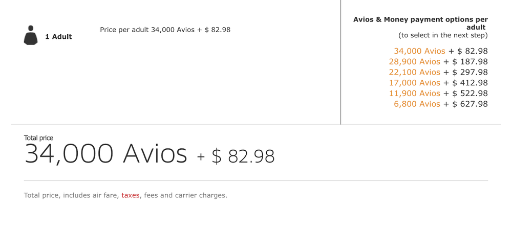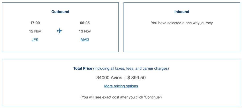 For example, consider the following flight from New York JFK to Madrid on Iberia business class: while both programs charge 34,000 Avios (an incredibly low amount for transatlantic business class, especially if you factor in the 30% or 50% bonuses from RBC Avion or Amex MR to British Airways Avios), we can see that Iberia only charges only US$82.98 ($110) in total taxes and fees…