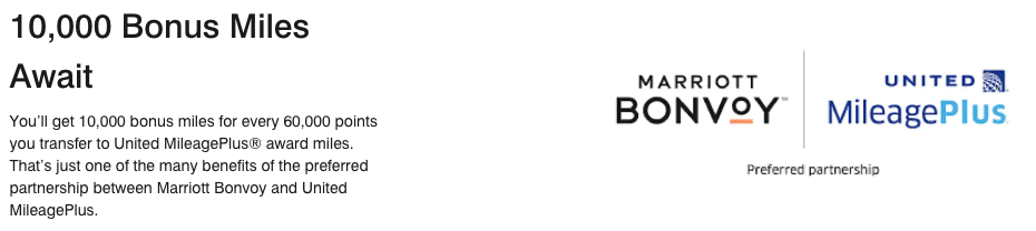 Lastly, Marriott Bonvoy has a special partnership with United MileagePlus, the loyalty program for United Airlines. Instead of the standard bonus of 5,000 miles, you’ll receive 10,000 United miles if you transfer 60,000 Bonvoy points at one time.
