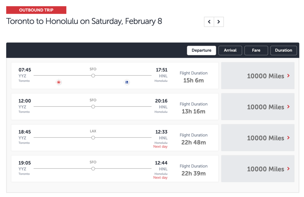 For example, suppose you have 170,000 Aeroplan points in your account, and you’d like to book a last-minute round-trip flights in United Polaris business class for two between Vancouver and French Polynesia via San Francisco.