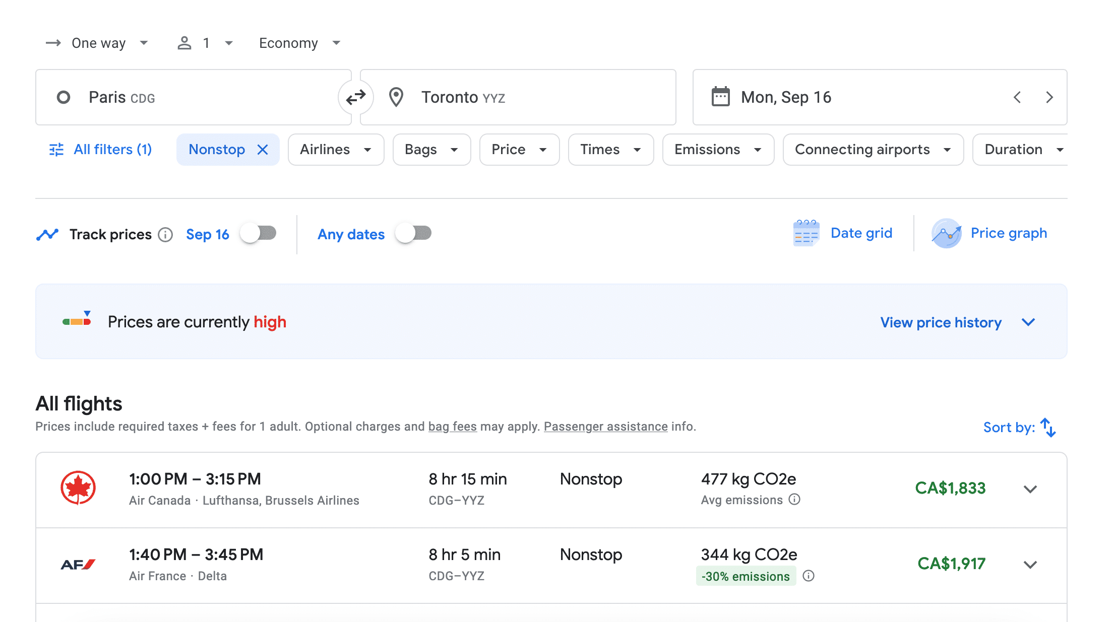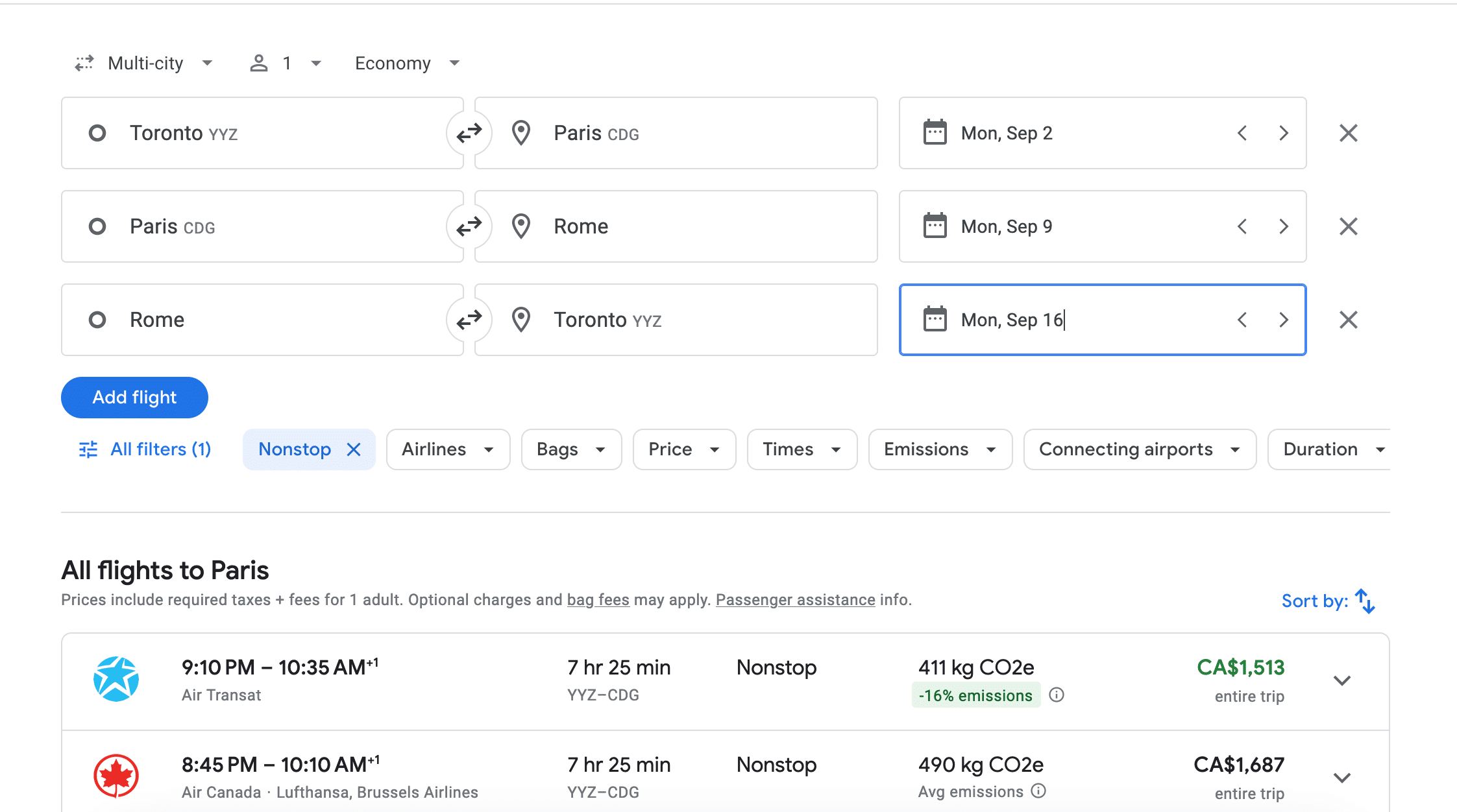 However, if you were to book this same route as three one-way tickets instead, the cost would be a whopping $2,689 for non-stop flights due to an extremely elevated cost on the returning Paris to Toronto flight.
