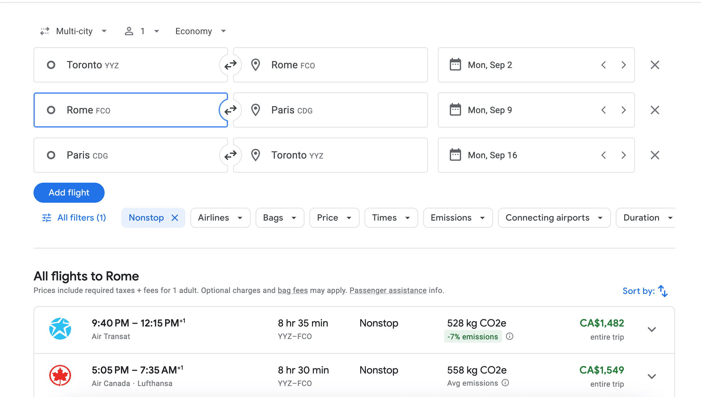 To illustrate how different flight combinations work, let’s say you live in Toronto and would like to visit Paris and Rome as part of a trip to Europe. There are a few possible ways to book these flights, and it’s certainly worthwhile to spend some time determining which one would be the most cost-effective.