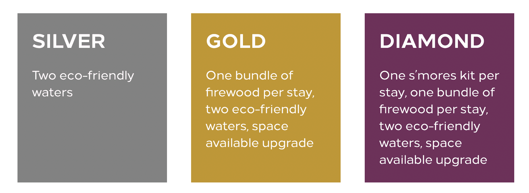 - Diamond Elite: one s’mores kit per stay, one bundle of firewood per stay, two eco-friendly waters, space-available upgrade