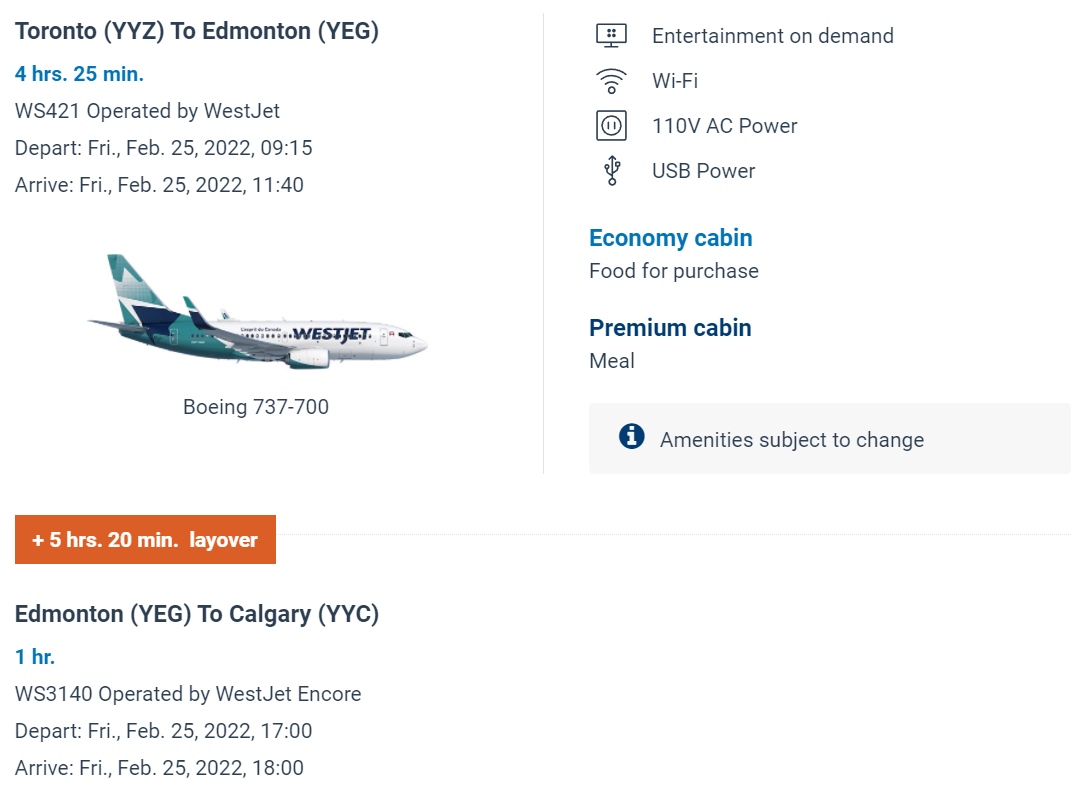 In the above example, Wi-Fi is offered on the flight from Toronto to Edmonton, but not on the flight from Edmonton to Calgary.