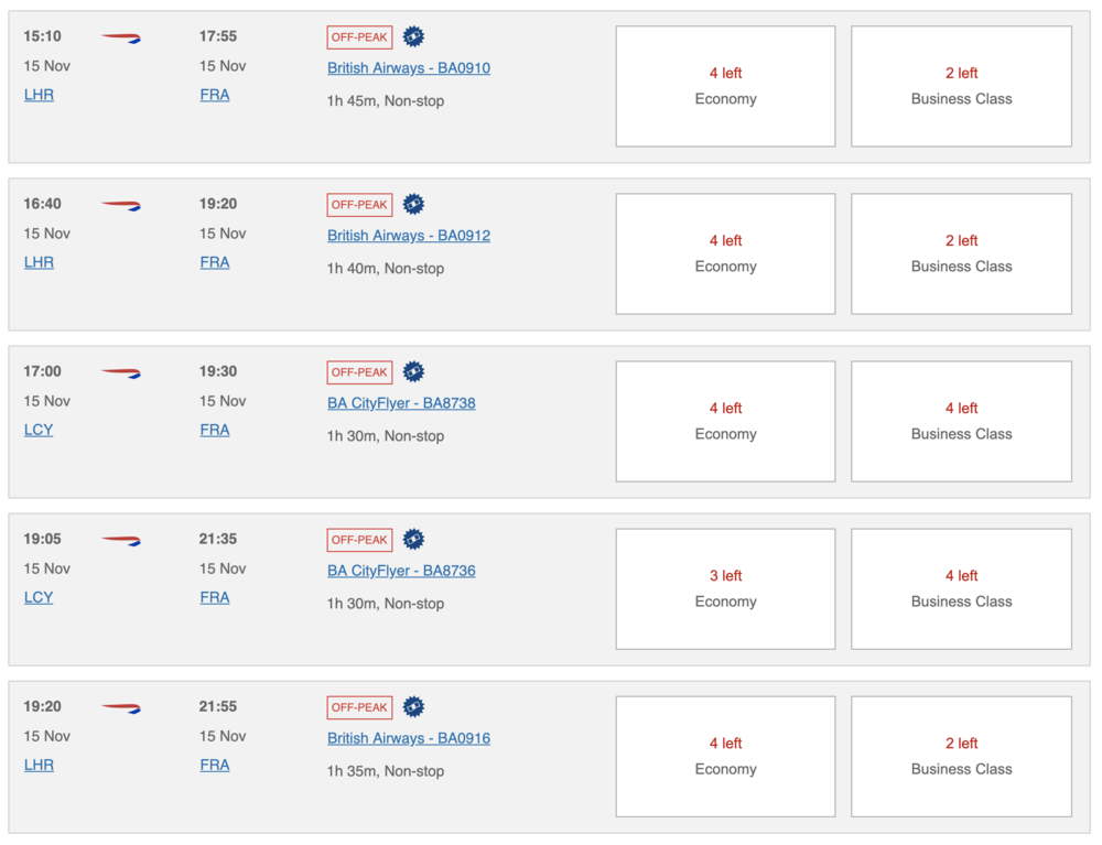 Similarly, the British Airways Executive Club website works very well with co-terminals. Redeeming Avios on short-haul European flights is often great value, and a search for LON as the origin or destination allows you to capture all of British Airways’s services out of Heathrow, Gatwick, or City Airport.