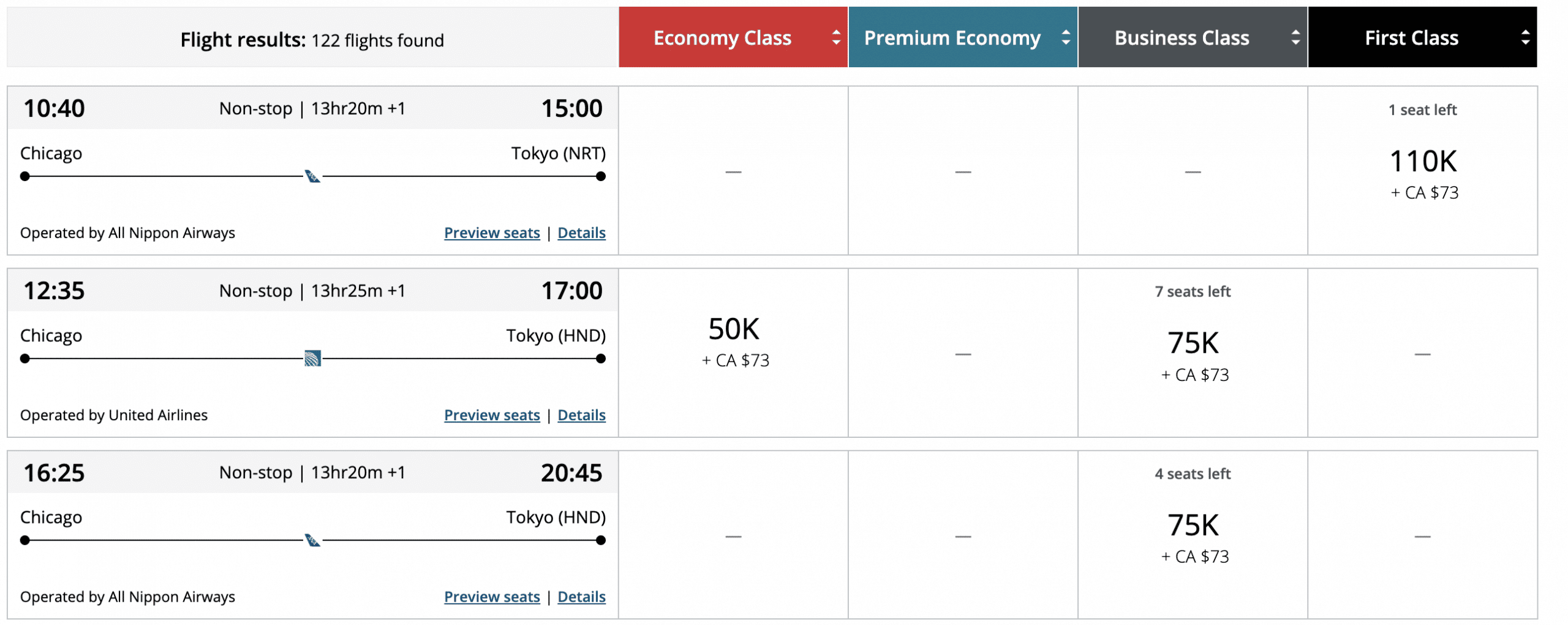 When searching for Star Alliance awards, Aeroplan and ExpertFlyer also allow you to search for co-terminals. A search between Chicago (ORD) and Tokyo (TYO), for example, captures all of United and ANA’s daily direct flights between Chicago and Haneda/Narita.
