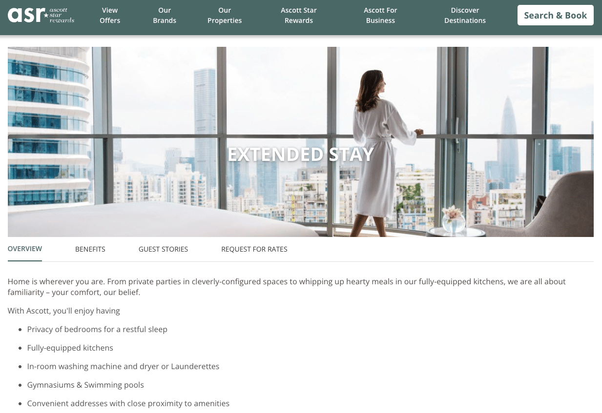 For stays of 30 days or more, guests can submit a request through Ascott’s long-stay inquiry form to receive a customized rate based on their length of stay, destination, and property availability. These negotiated rates often include lower nightly pricing, added flexibility, and extra perks like housekeeping credits.
