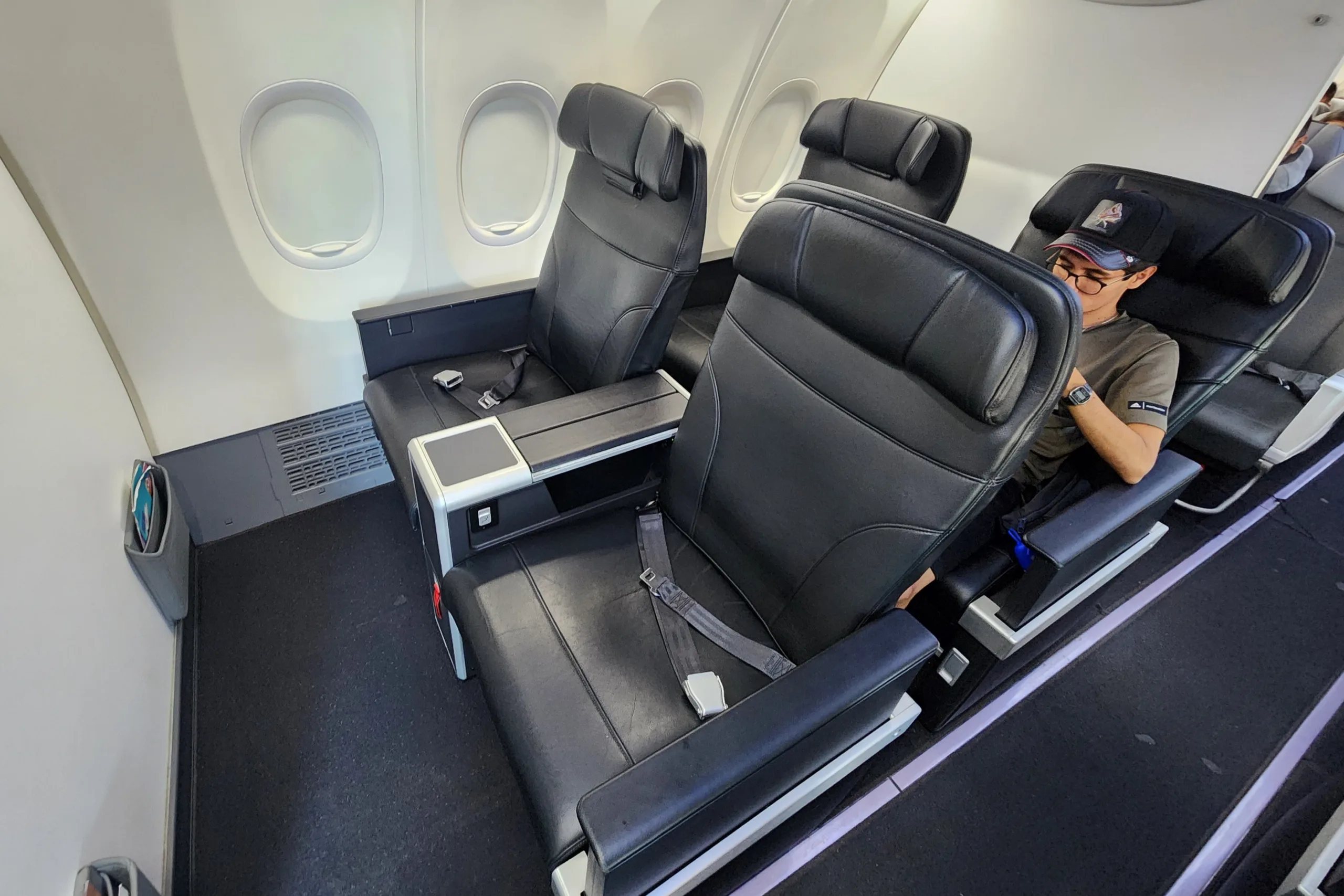 The first two rows on each aircraft are an exception, however, since these recliner seats, marketed as “Premium,” are arranged in a 2-2 configuration, similar to the narrowbody business class offering of other airlines.