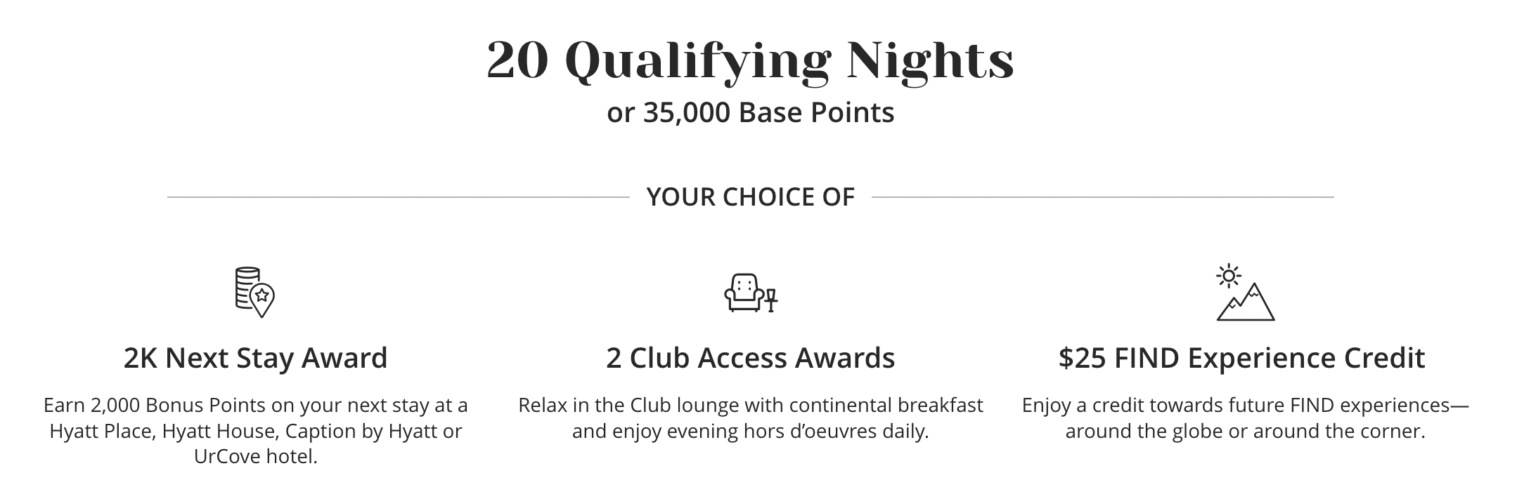 20 Nights or 35,000 Base Points: 2K Next Stay Award, 2 Club Access Awards, or $25 FIND Experience Credit
