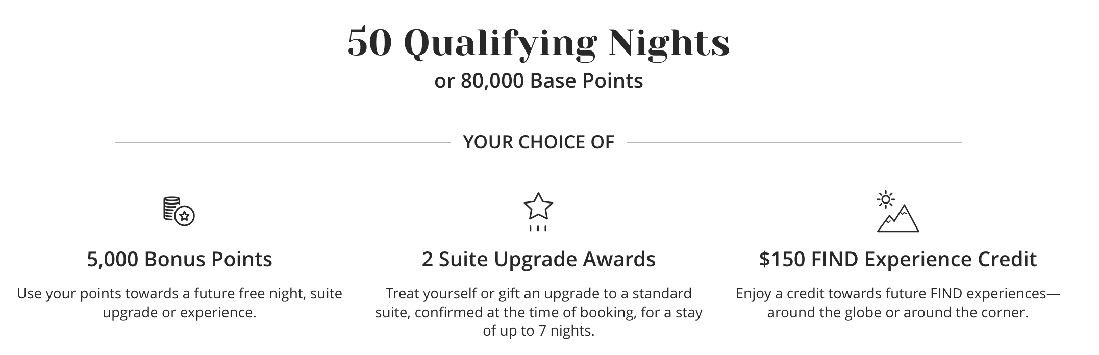 Upon reaching 50 nights or 80,000 base points ($16,000 of eligible spending), you can choose to receive 5,000 points, two Suite Upgrade Awards, or a $150 FIND Experience Credit.