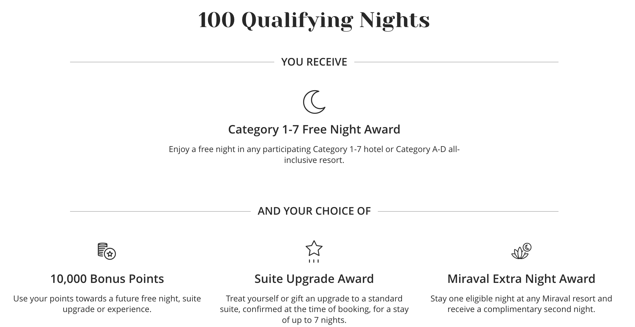 Upon reaching 100 nights, you’ll automatically receive another Category 1–7 Free Night Award (valid for 180 days), and can also choose 10,000 points, a Suite Upgrade Award, or a Miraval Extra Night Award.