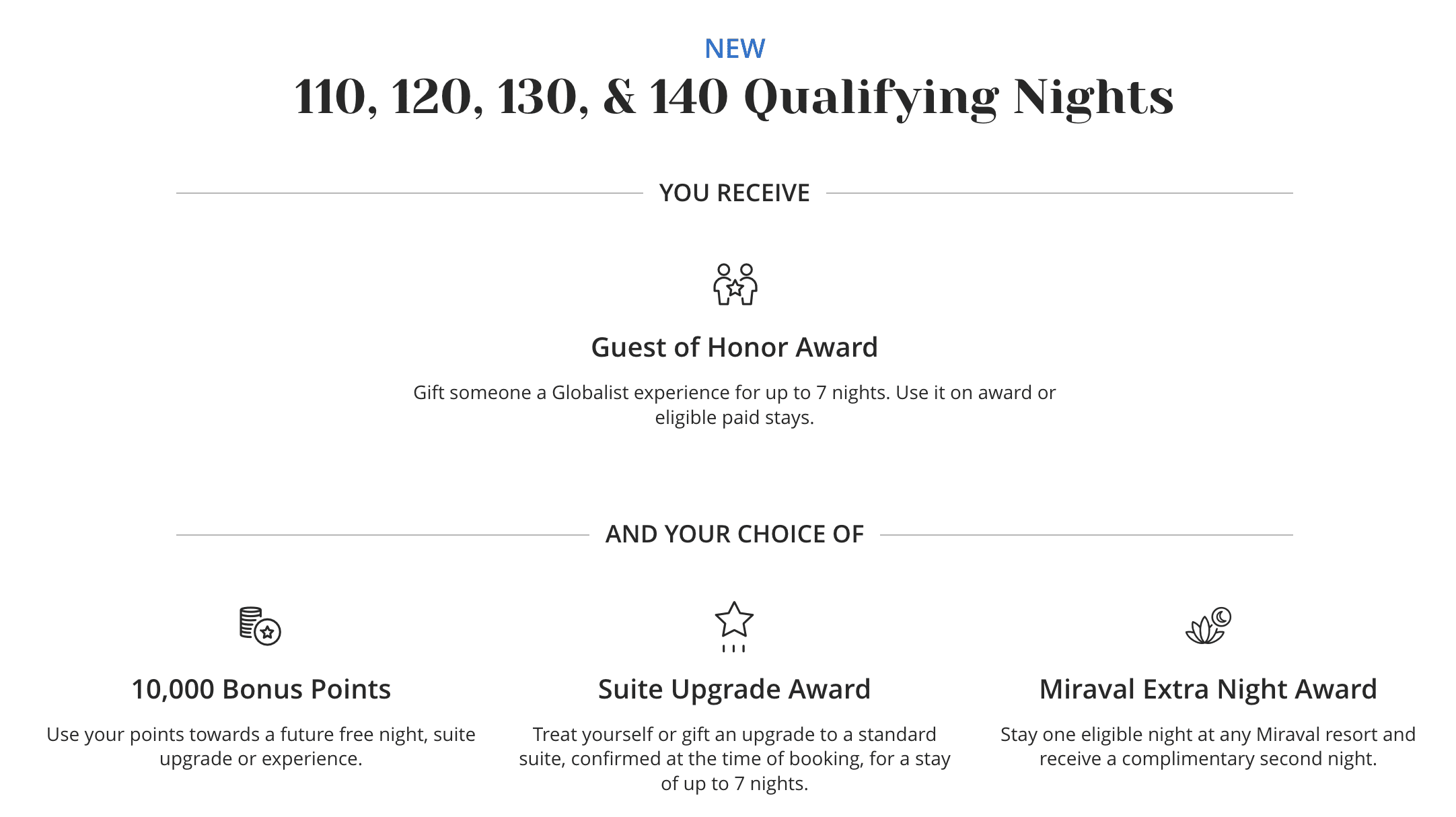 110, 120, 130, and 140 Nights: One Guest of Honor Award + 10,000 Bonus Points, One Suite Upgrade Award, or Miraval Extra Night Award