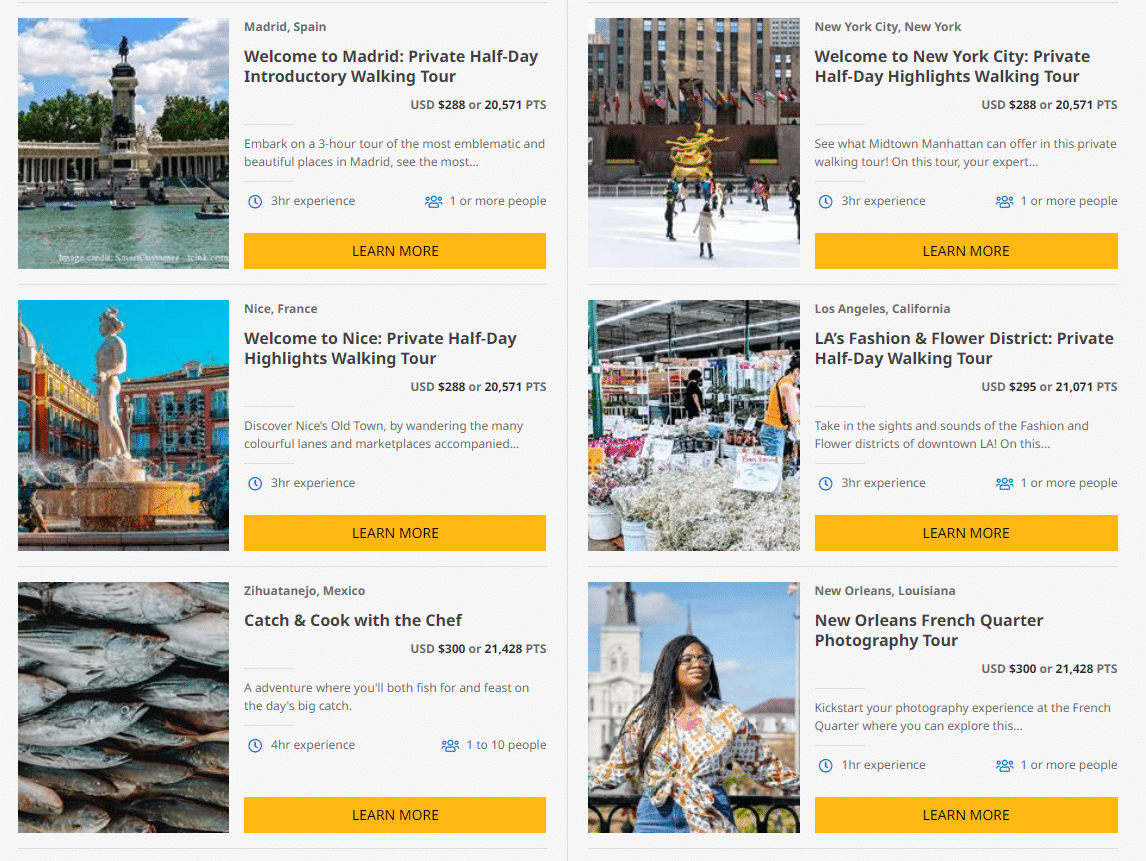 With some experiences pricing within the $20–30 (USD) range, you’ll likely find something to use the credit on. However, keep in mind that this award is valued less than the 2,000 points booster you may choose above.