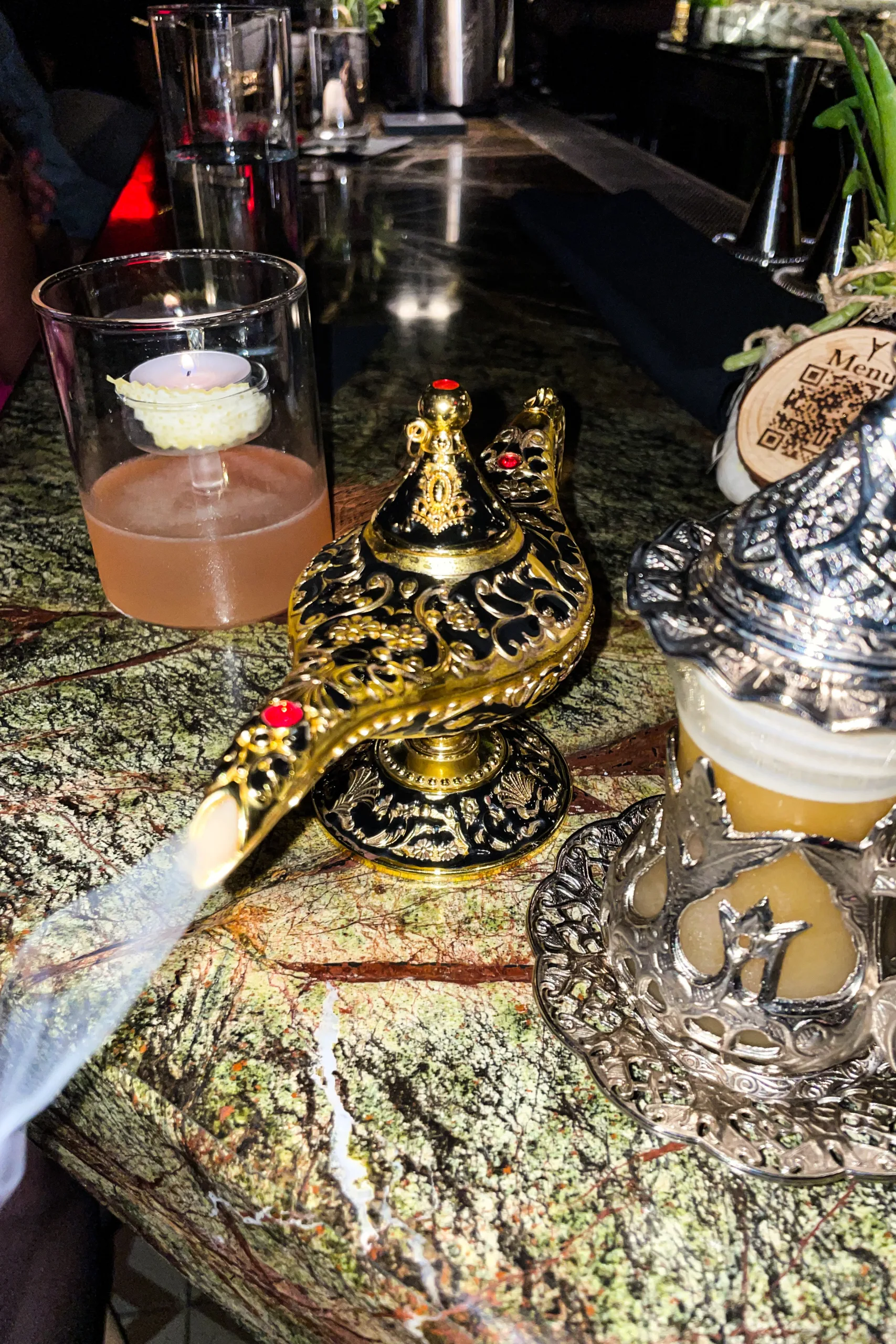 What to order: If you like a floral cocktail, I recommend the “Agrabah,” which features dark rum, pistachio, and orange blossom. It comes in a traditional Moroccan-style small glass and is accompanied by a genie lamp with some roasted nuts inside.